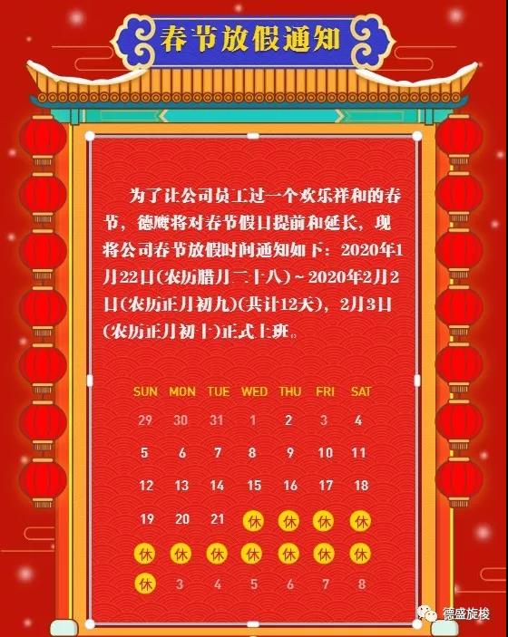 为了让公司员工过一个欢乐祥和的春节,德鹰将对春节假日提前和延长,现将公司春节放假时间通知如下:2020年1月22日(农历腊月二十八)~2020年2月2日(农历正月初九)(共计12天),2月3日(农历正月初十)正式上班。